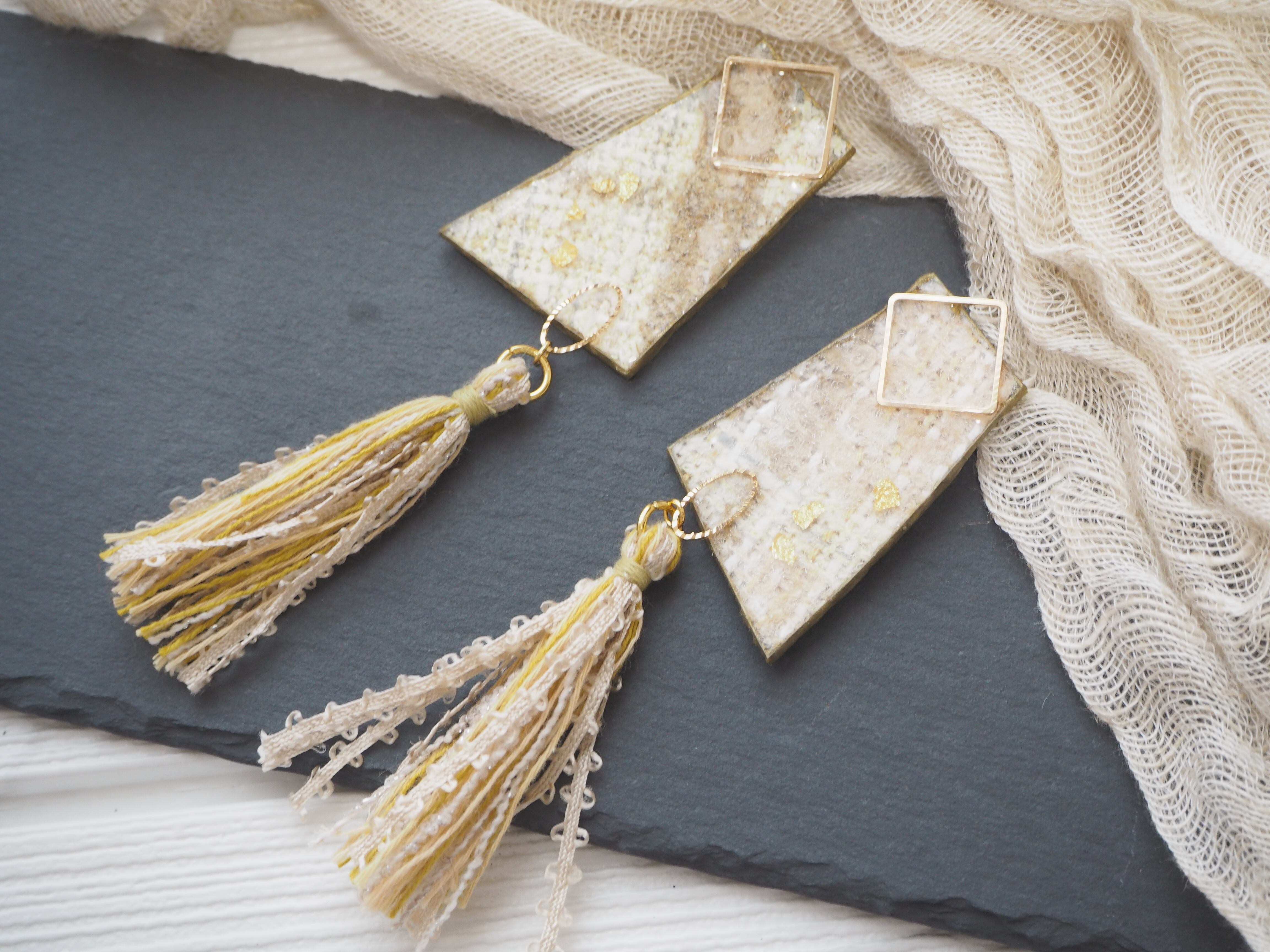 手織り布をコーティングしたパーツによる、大ぶりのアクセサリーです。
