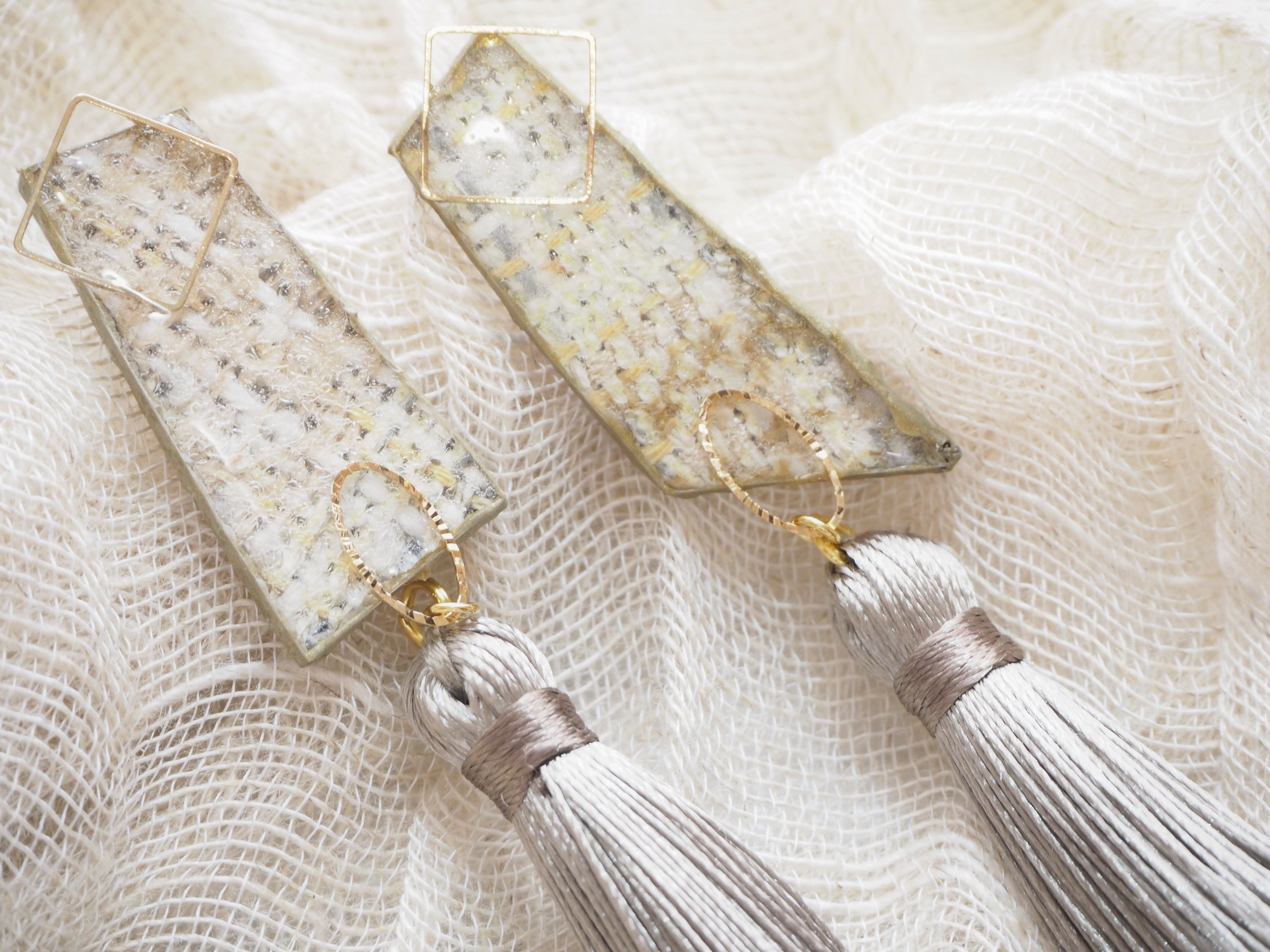 手織り布をコーティングしたパーツによる、大ぶりのアクセサリーです。
