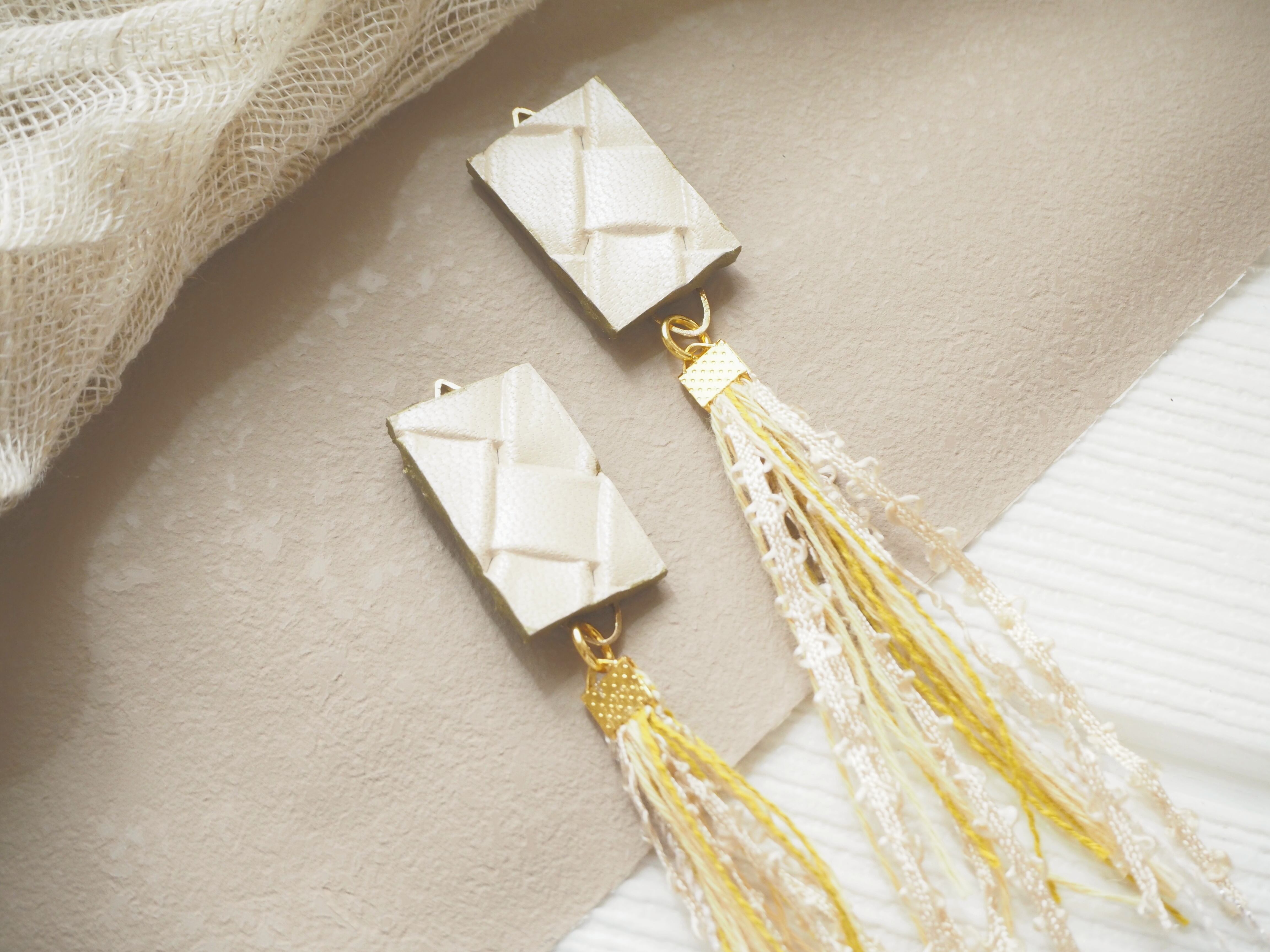 手織り布をコーティングしたパーツによる、大ぶりのアクセサリーです。
