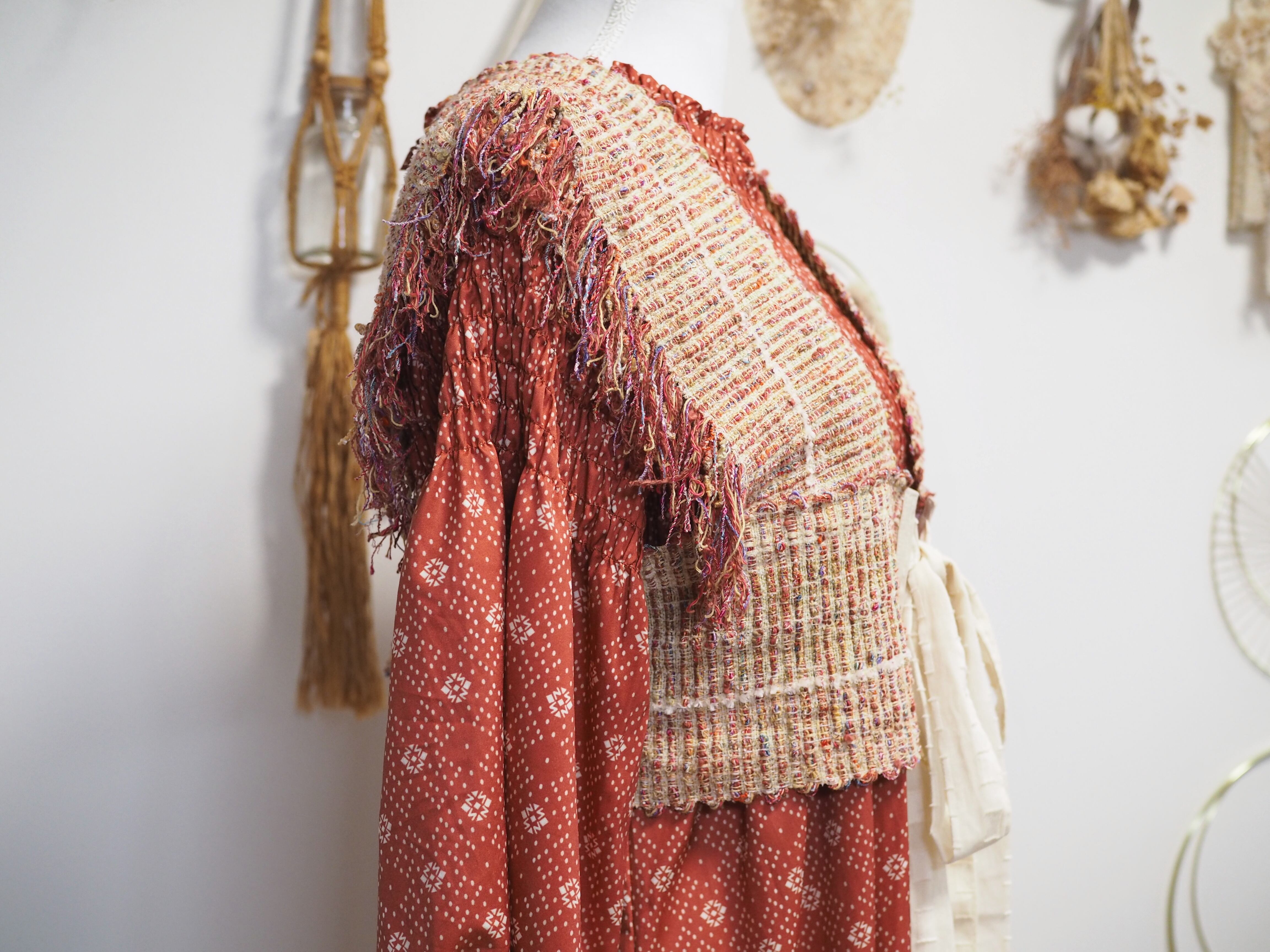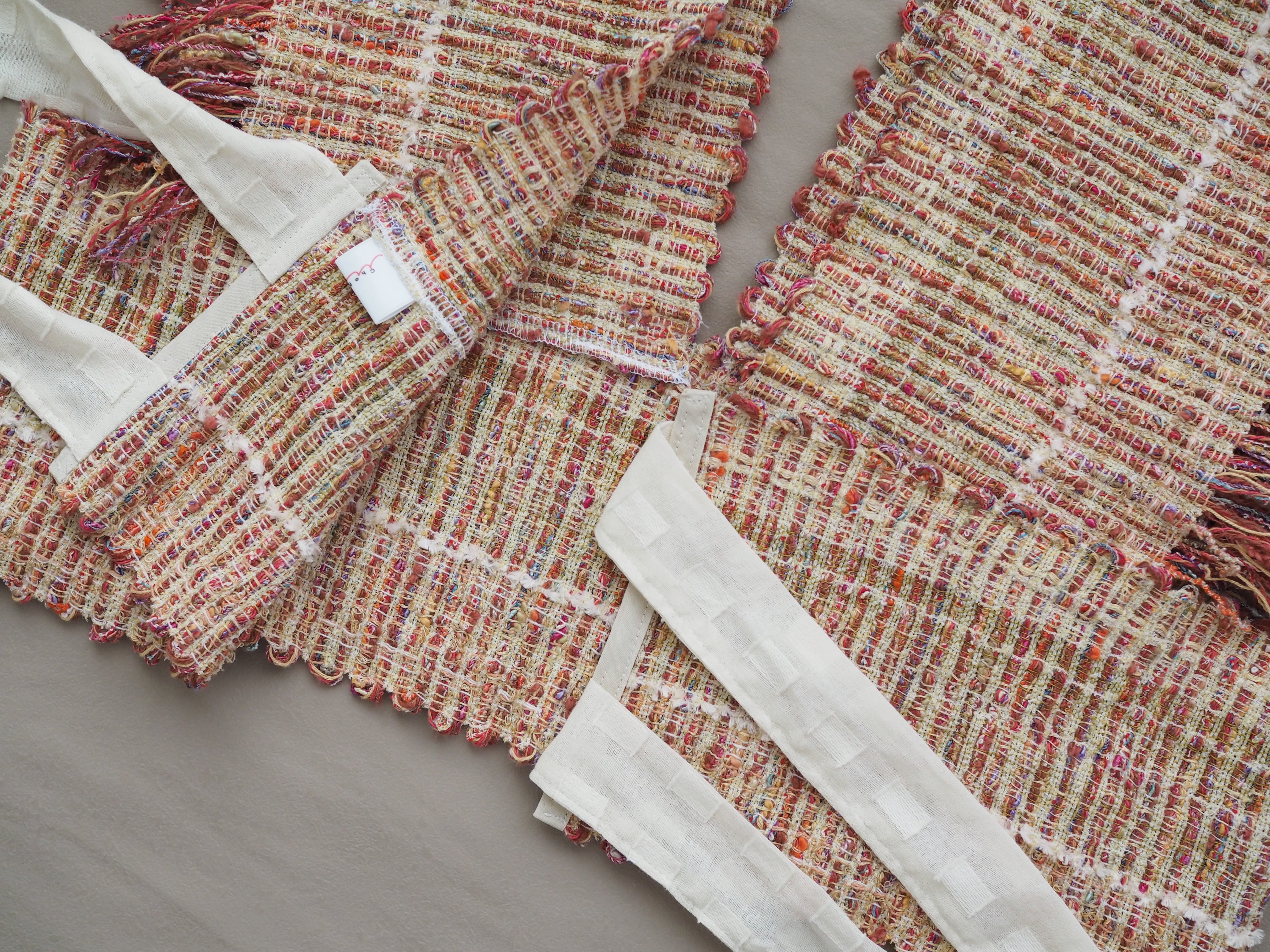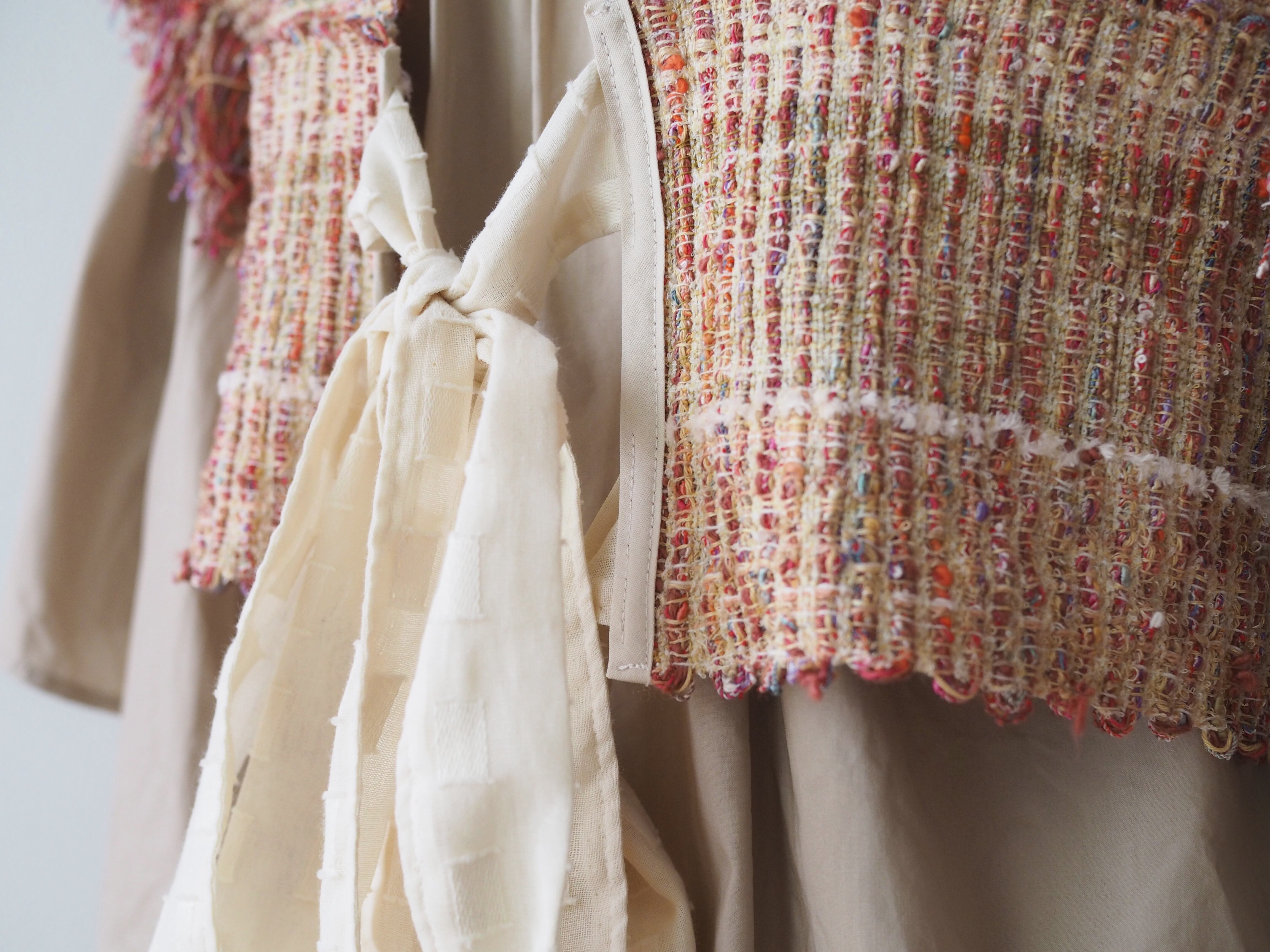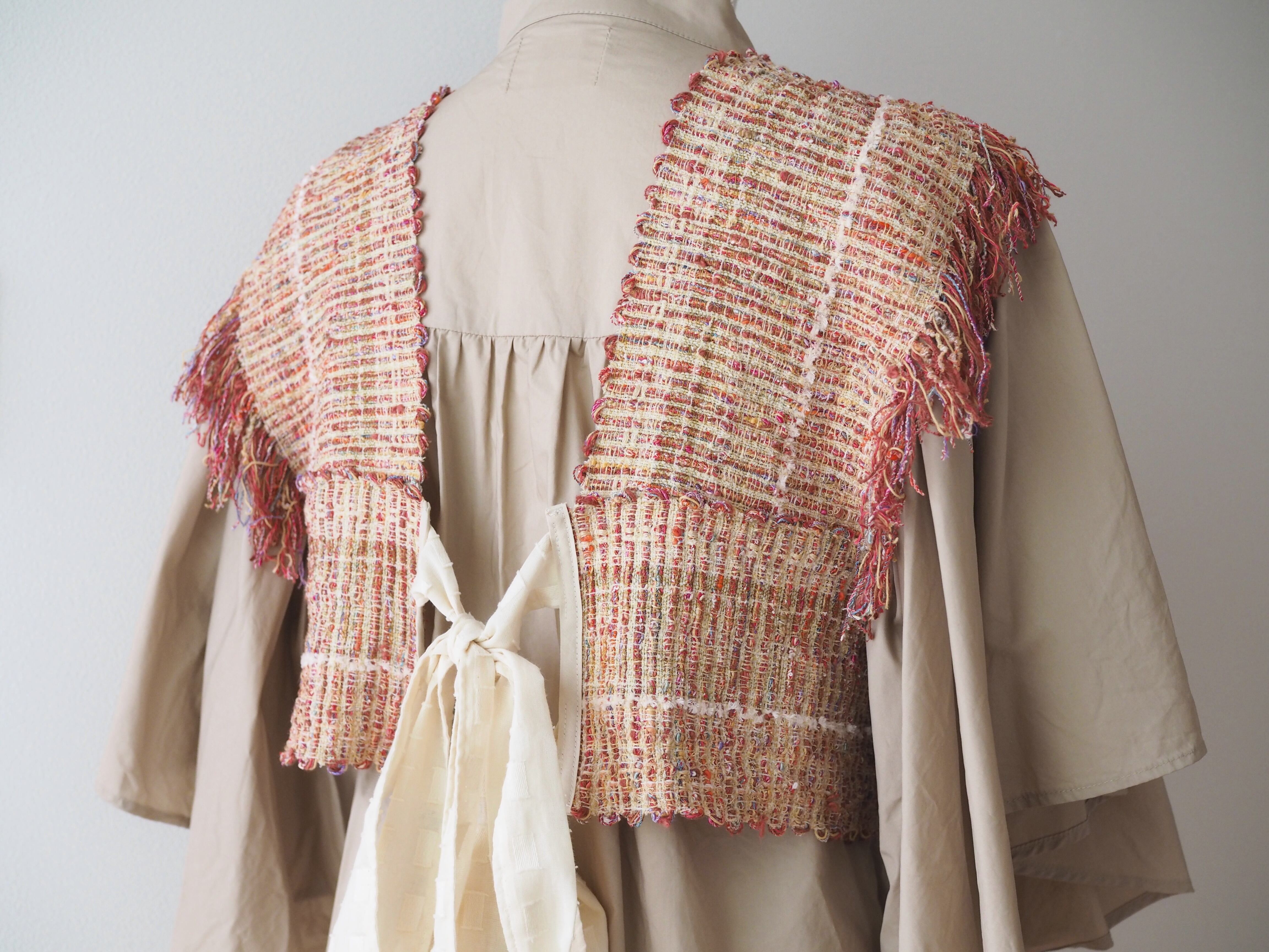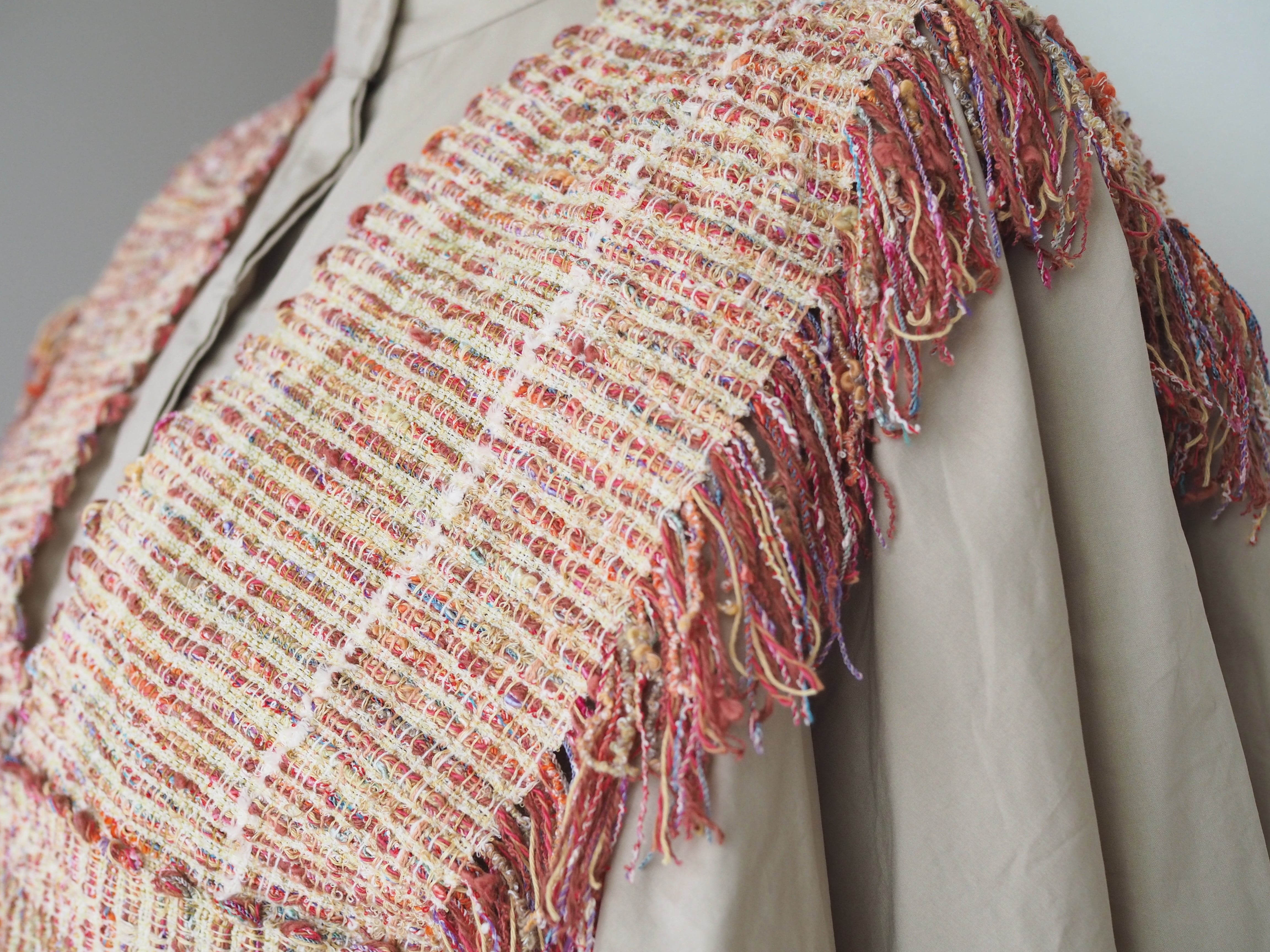 身頃部分のフリンジデザインには、よこ糸に使った素材たちそれぞれの面白さをそのまま活かしました。