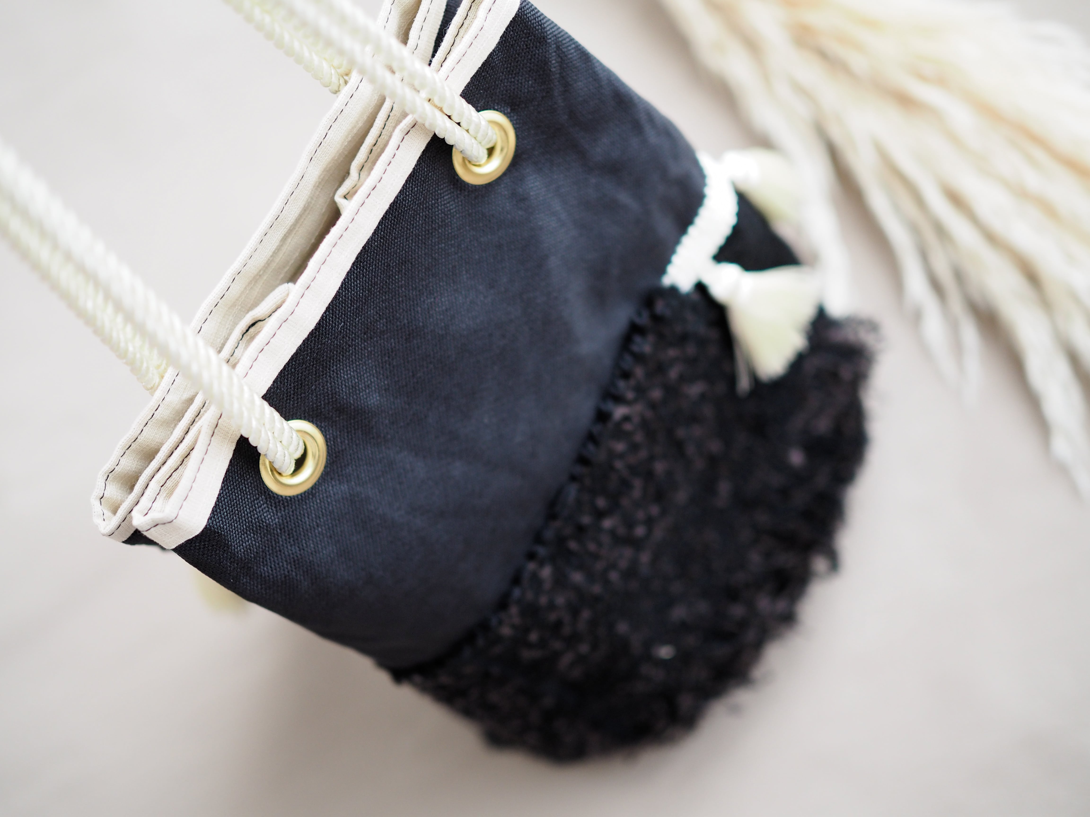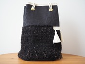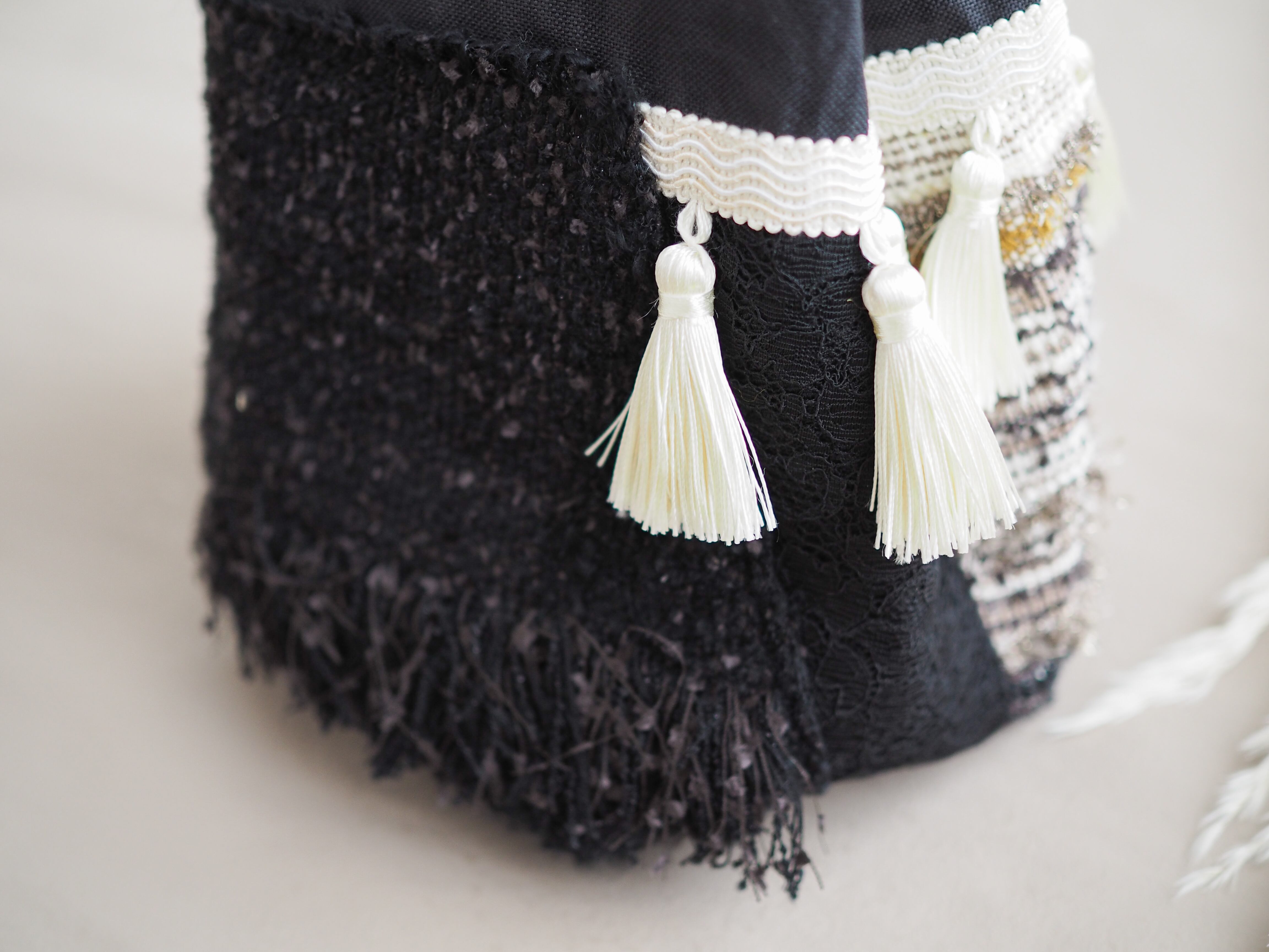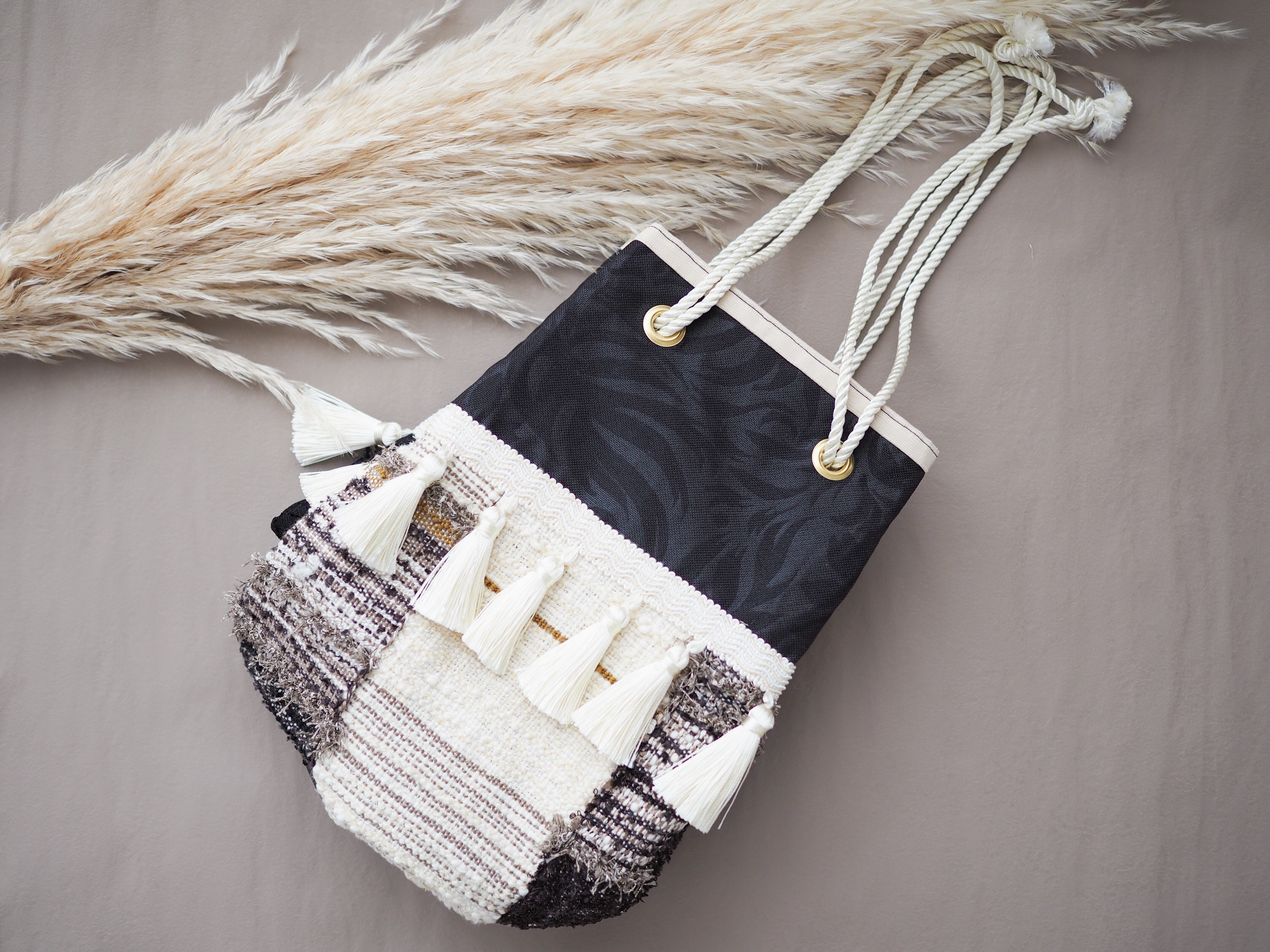 手織り生地・カーテン生地・タッセルリボンをパッチワークのように合わせた、巾着型のバッグです。