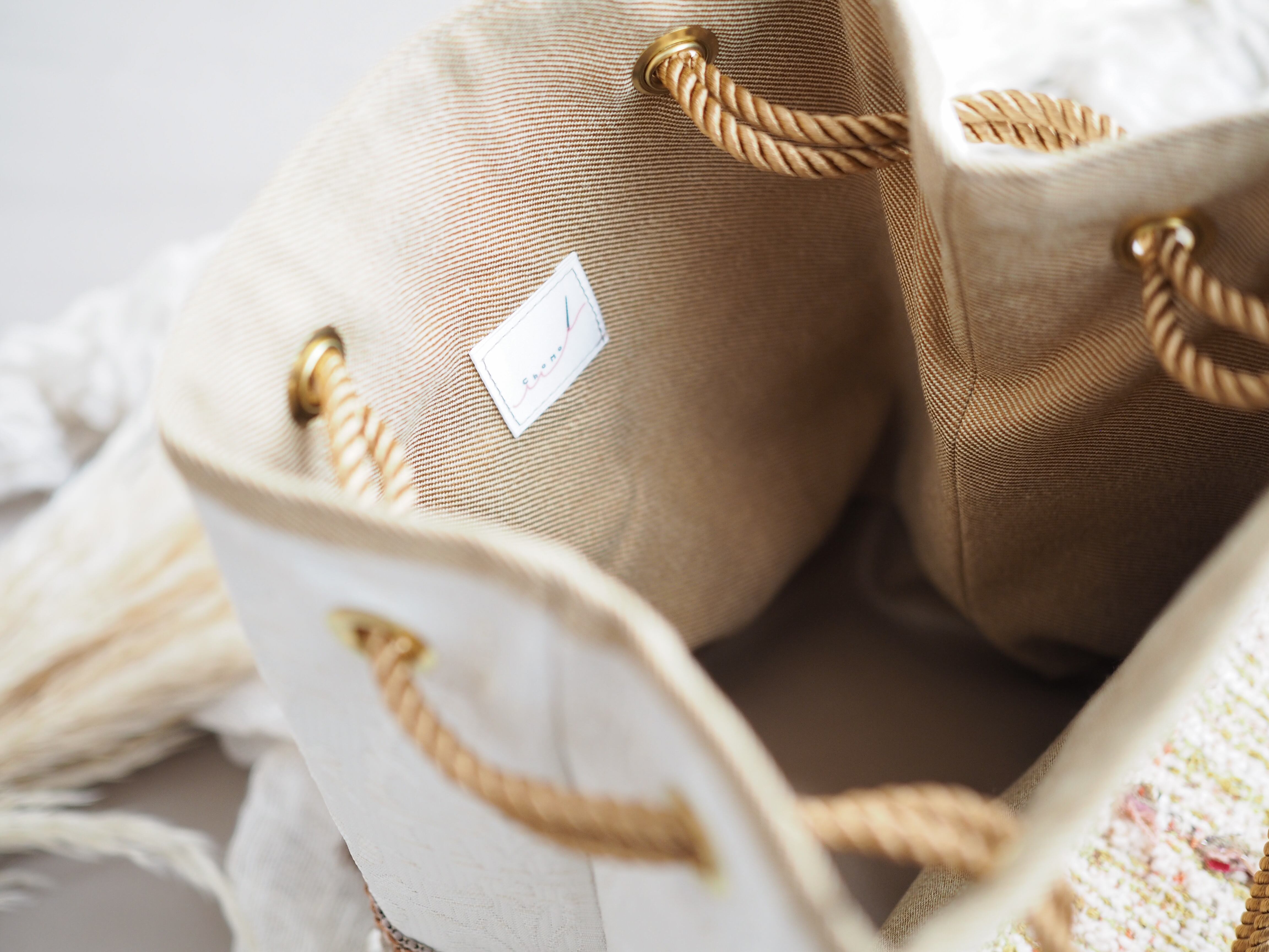 手織り生地のあたたかな雰囲気と暖色の明るい色味が相まって、とても春らしい一品。
