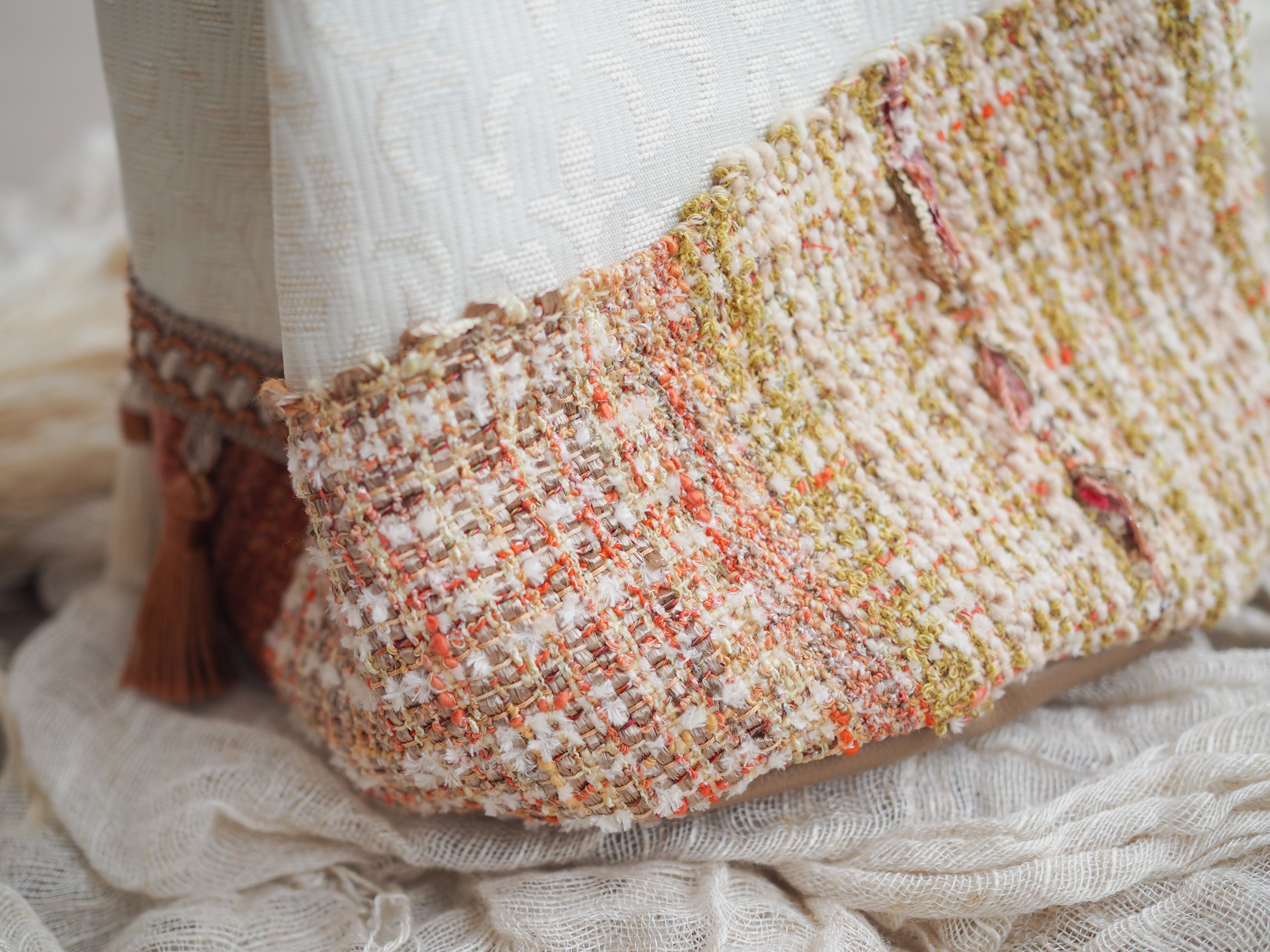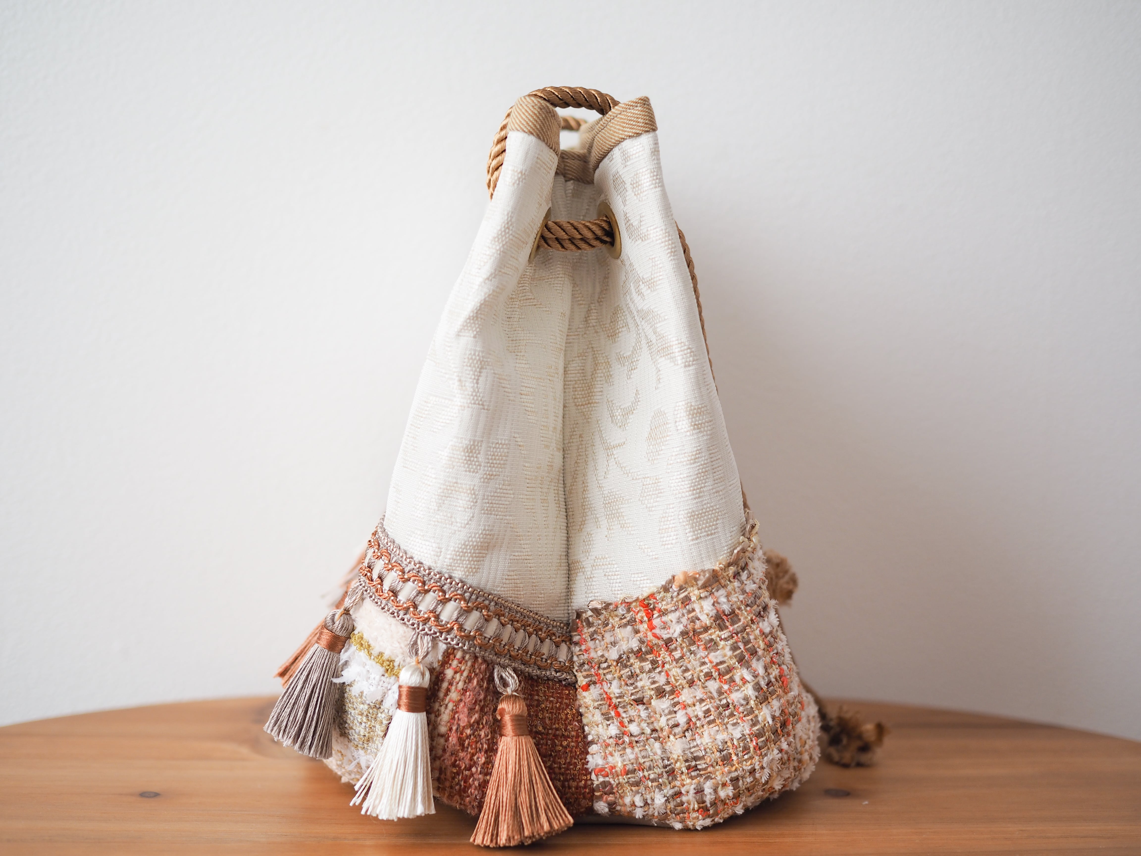 手織り生地・カーテン生地・タッセルリボンをパッチワークのように合わせた、巾着型のバッグです。
