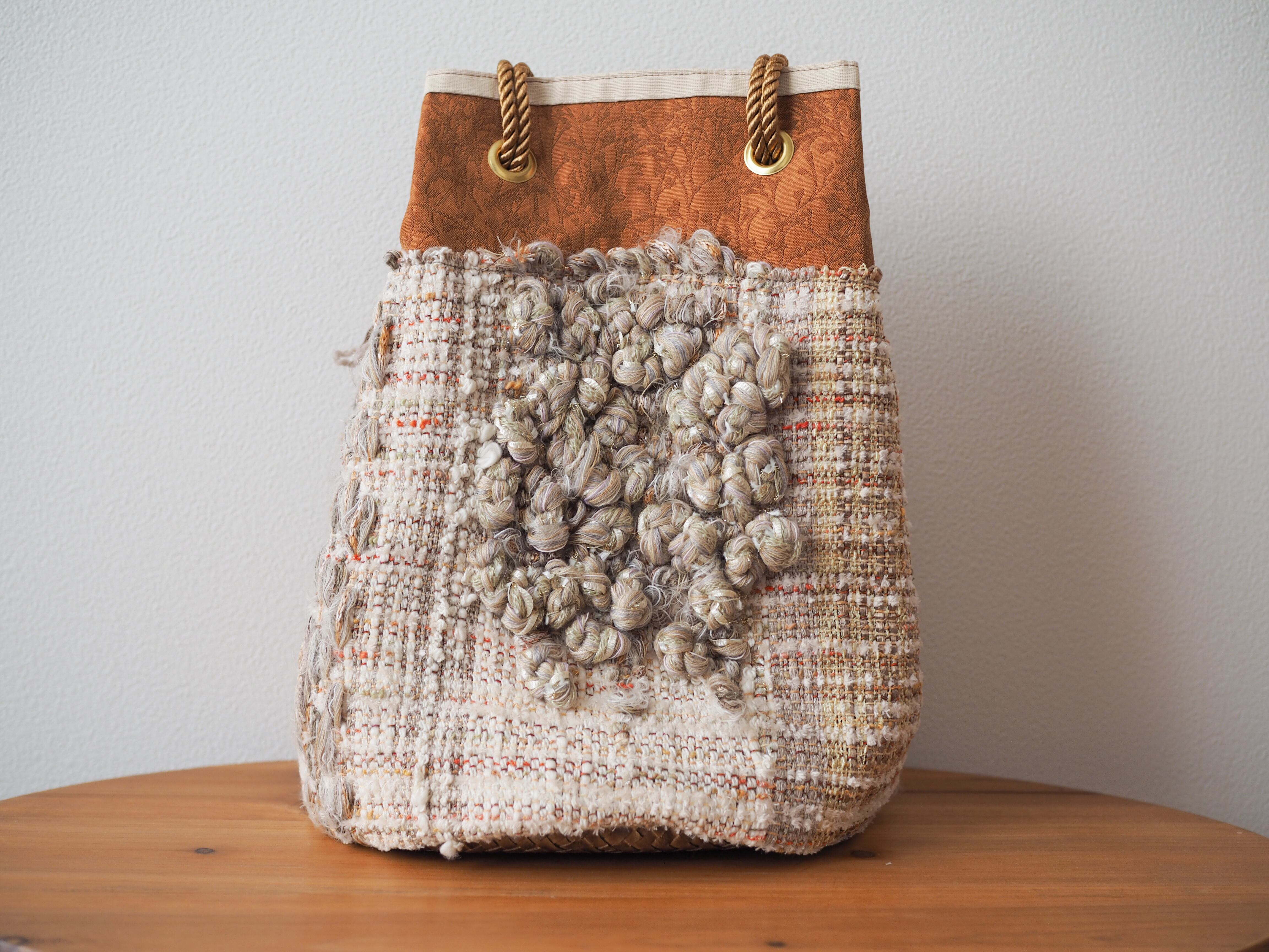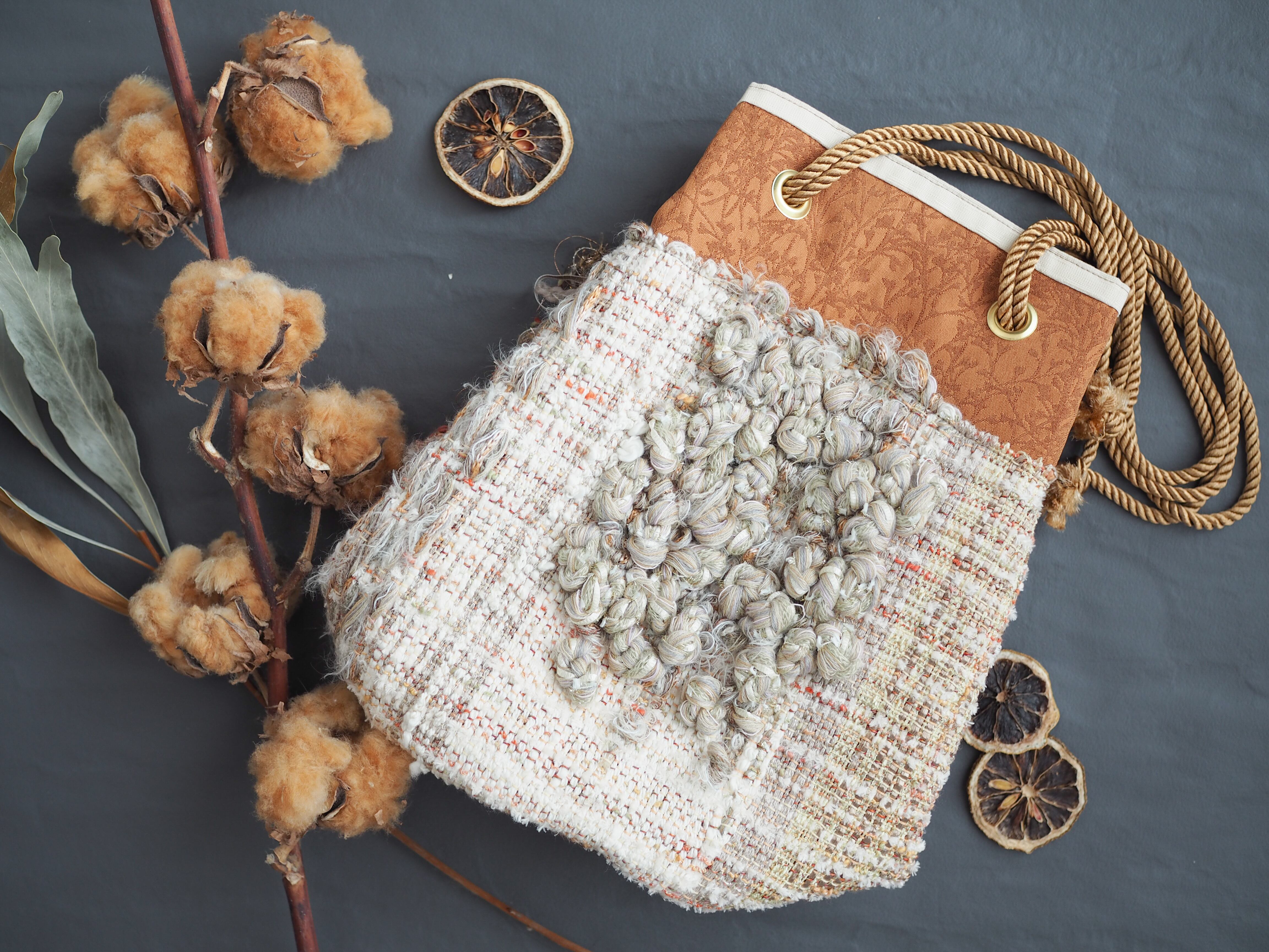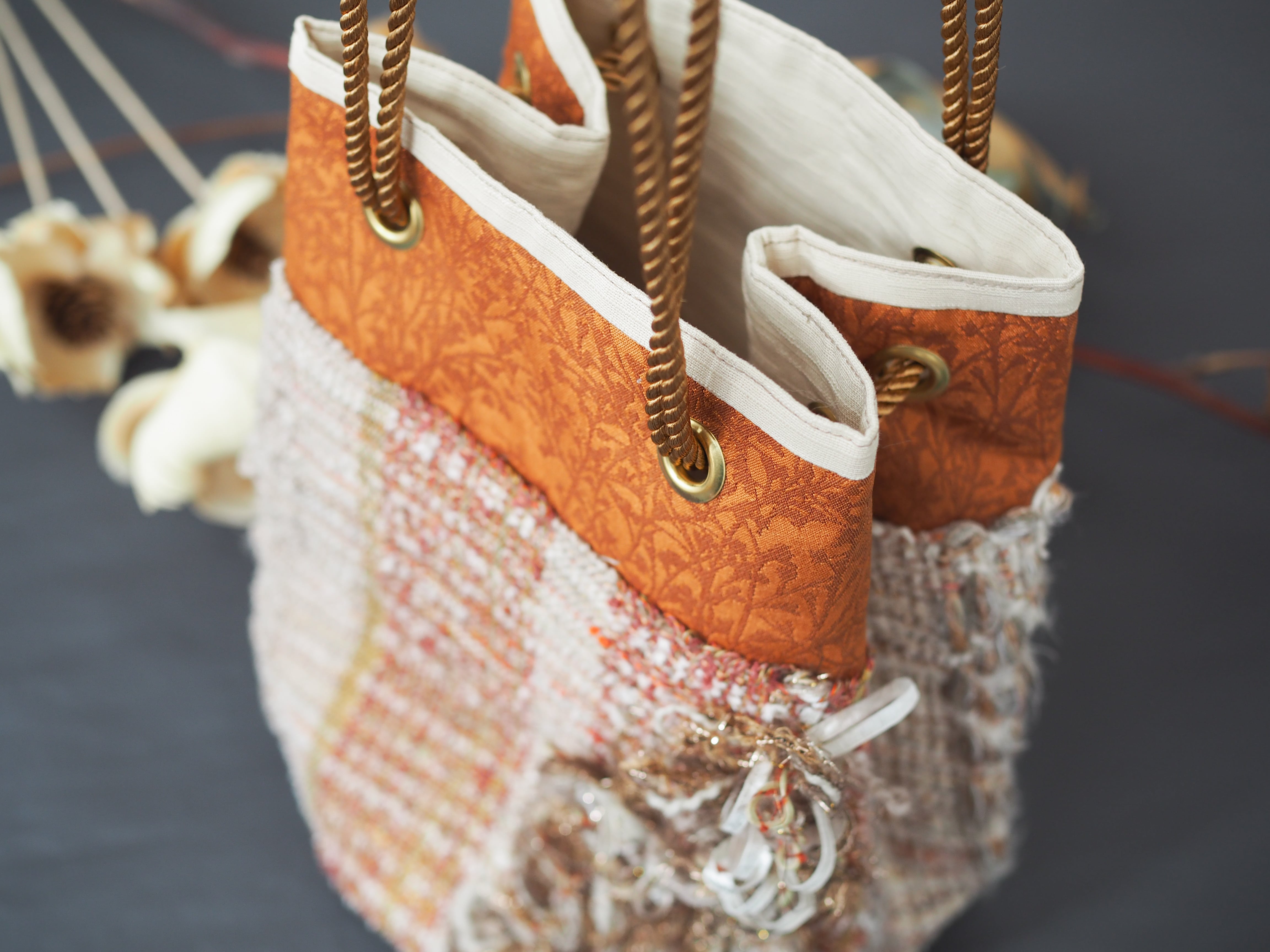 手織り生地・カーテン生地をパッチワークのように合わせた、巾着型のバッグです。