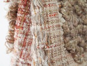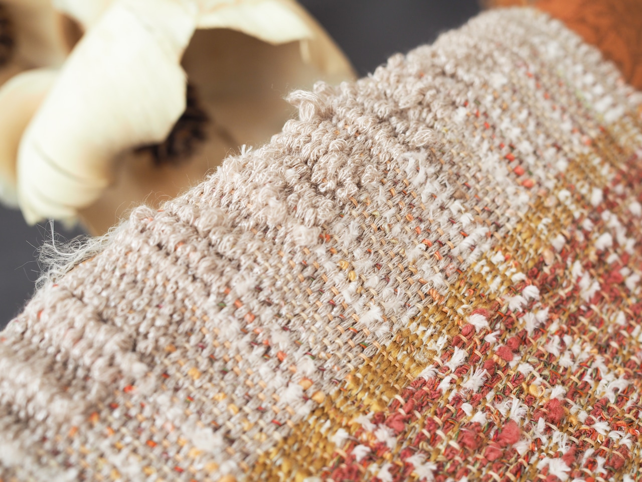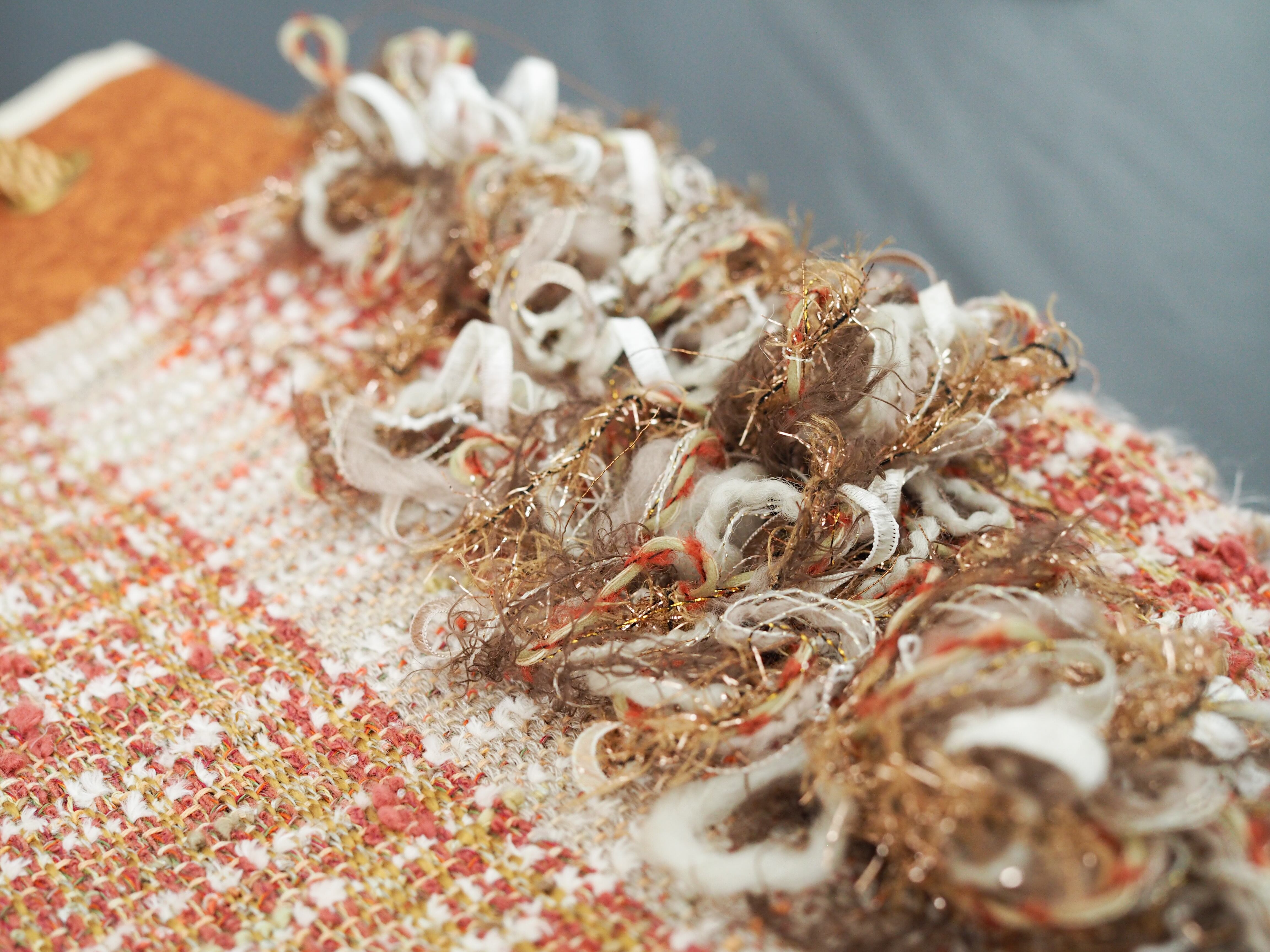糸をループ状に織った部分(2枚目参照)、浮き上がるように織った部分(4枚目参照)、ころころと丸九飛び出るように織った部分(7枚目参照)など、手織りにしか出来ない表現をぎゅっと詰め込んだ布地です。